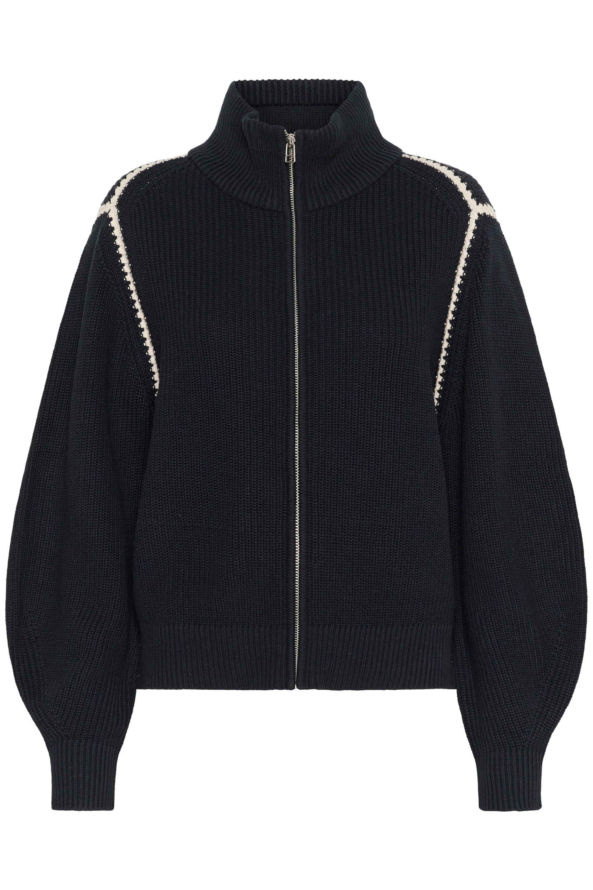 This knitted zip-up cardigan features a high collar and contrast details at the shoulders for a sporty touch. The soft, chunky rib knit and relaxed fit make it ideal as an extra layer on cooler days – perfect with jeans or casual dresses.