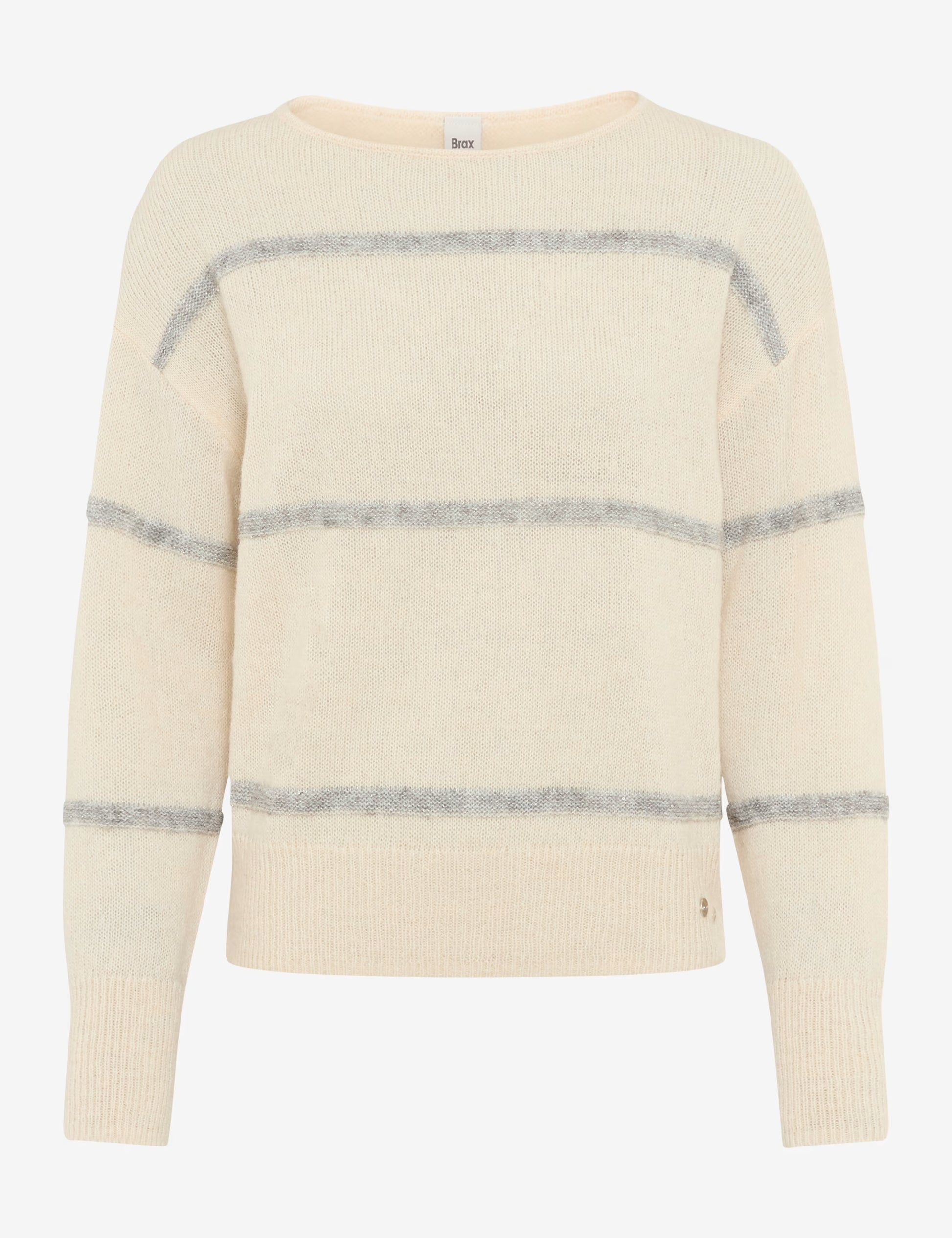 With its clean lines and relaxed silhouette, the LISA crew neck sweater brings a fresh, vibrant feel to your knitwear wardrobe. The straight fit with dropped shoulders lends the sweater a modern, casual look, while striking horizontal stripes with fine lurex threads and sparkling mini sequins add structure and a touch of glamour. Wide ribbed cuffs and hem create harmonious accents and emphasize the relaxed character of the style. Crafted from a luxurious blend of materials, the sweater impresses not only visually but also with its pleasant feel: The soft knit of polyamide, wool, alpaca wool, and a hint of polyester promises lightness and a gentle fluffiness. Natural fibers provide cozy warmth while maintaining breathability – perfect for stylish layered looks on cooler days.