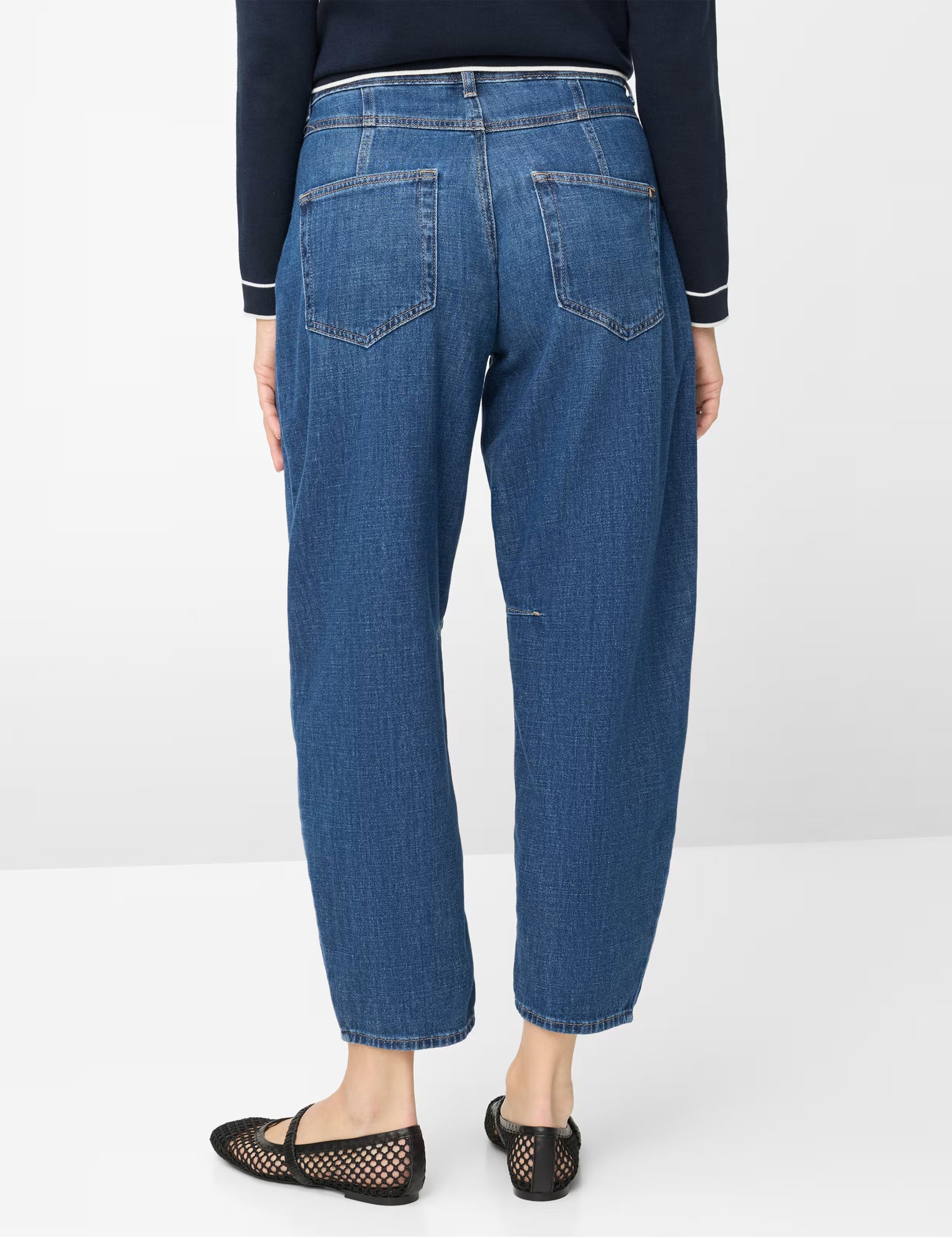The barrel jeans in STYLE MEGAN S are sure to make fashion lovers' hearts beat faster: With a relaxed O-shape silhouette and high waist, they make a clear fashion statement, perfectly combining comfort and style. The cropped inseam emphasizes the modern look, while side pockets, a coin pocket, and patch back pockets add classic touches and practical details. Seams give the five-pocket design a sophisticated structure and underscore the contemporary style. The cotton blend ensures a comfortable feel and impresses with its flexibility and shape retention – so they remain comfortable without sacrificing casual style. The heritage denim stands out with its authentic look and lasting quality – it represents fashion consciousness, style, and uncomplicated effortlessness, as well as robust and durable.