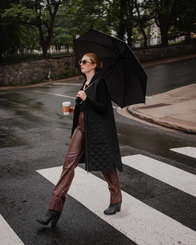 Long and lightweight liner vest designed to fit comfortably under the Mernini raincoats. Perfect as an insulator for those cooler rainy days or as a standalone fashionable outerwear jacket. Polyester filled with a quilted pattern, the long liner vest will keep you warm and looking stylish season after season.