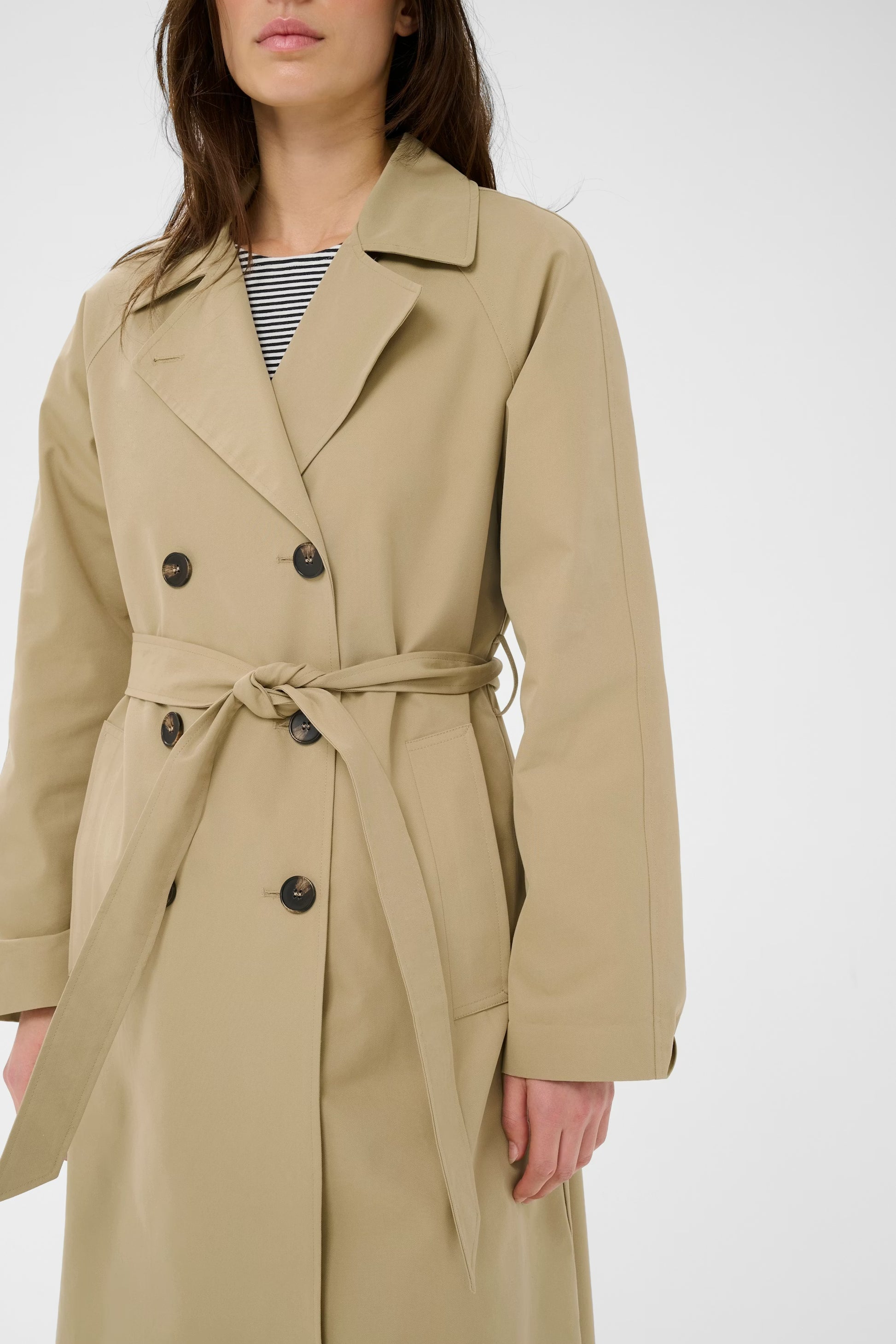 The model is 172 cm tall and is wearing a size 36. This classic trench coat features a double button fastening, a belt at the waist and a flattering length that falls just below the knee. Made from a soft, textured cotton blend, it has a timeless design that works season after season. Perfect for both work and leisure.