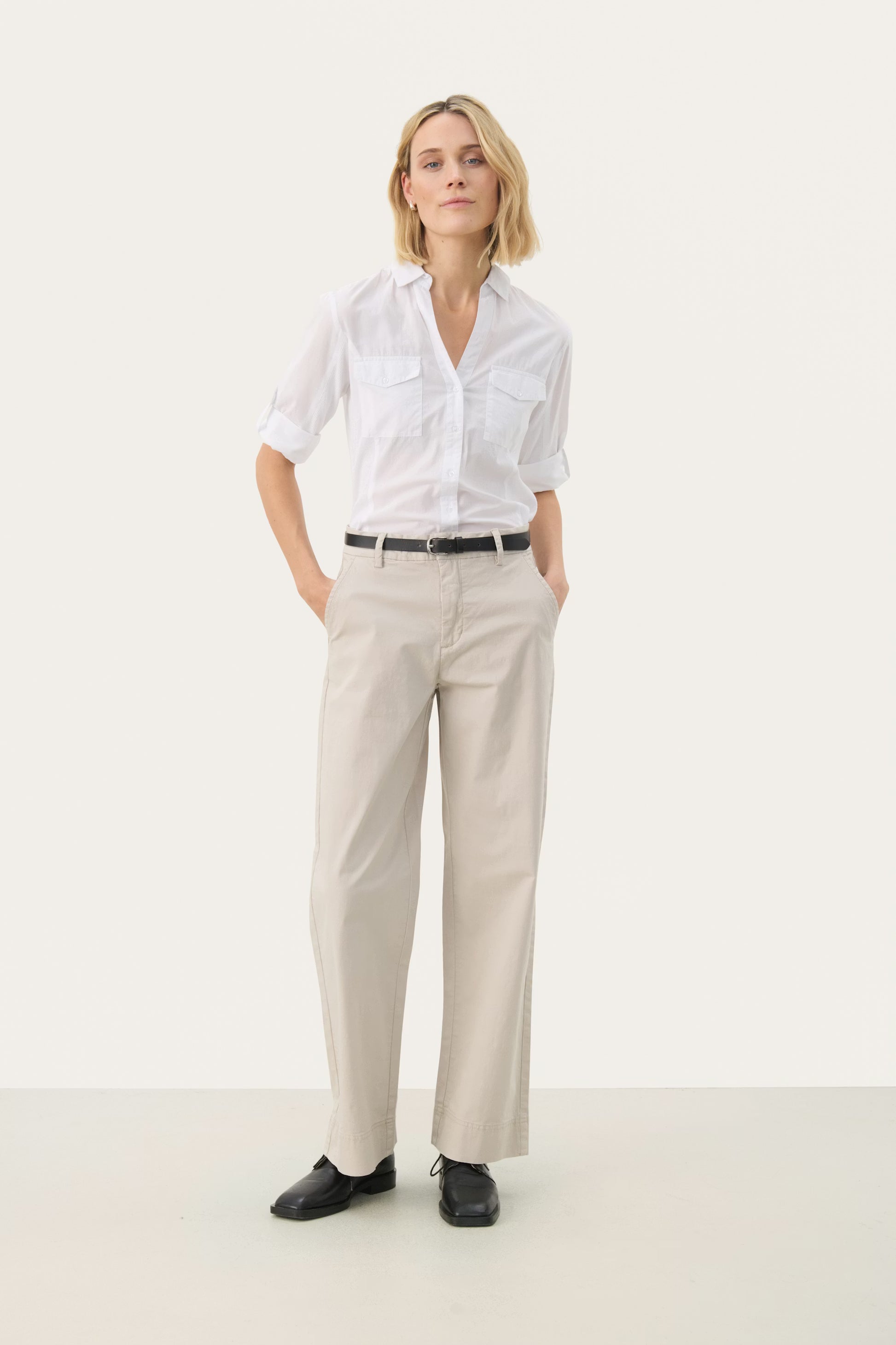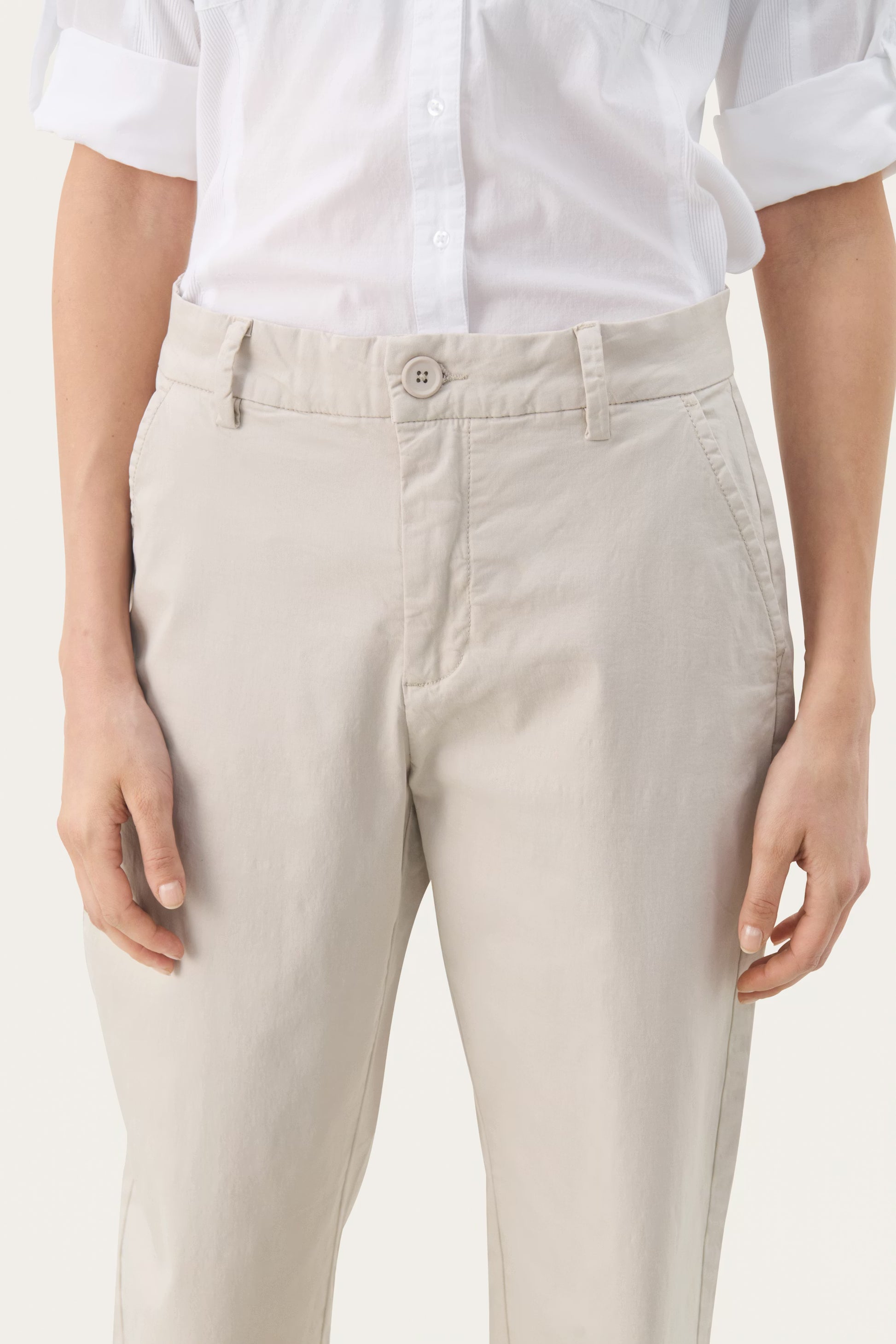 The model is 177 cm tall and is wearing a size 36. These timeless trousers are made from a lightweight, soft cotton fabric with a flattering straight leg. They have a fixed waistband with belt loops and discreet pockets, making them ideal for both casual and more formal looks. Style them with a shirt or a knit.