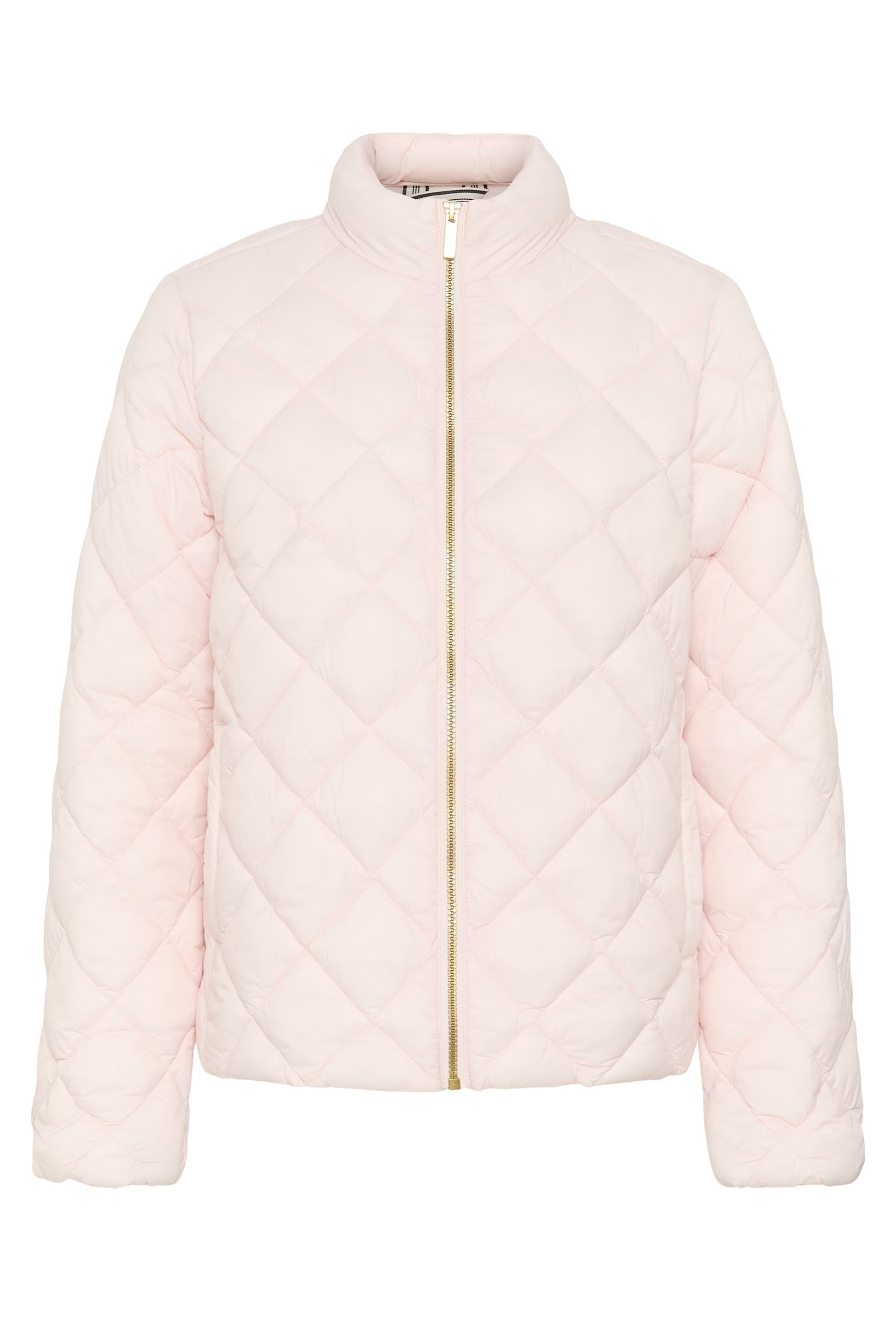 This quilted jacket in a light pink shade combines function and feminine expression. It features light padding, a high collar and a gold zipper, creating a simple yet modern silhouette. Wear it as a soft and stylish layer on cool days.