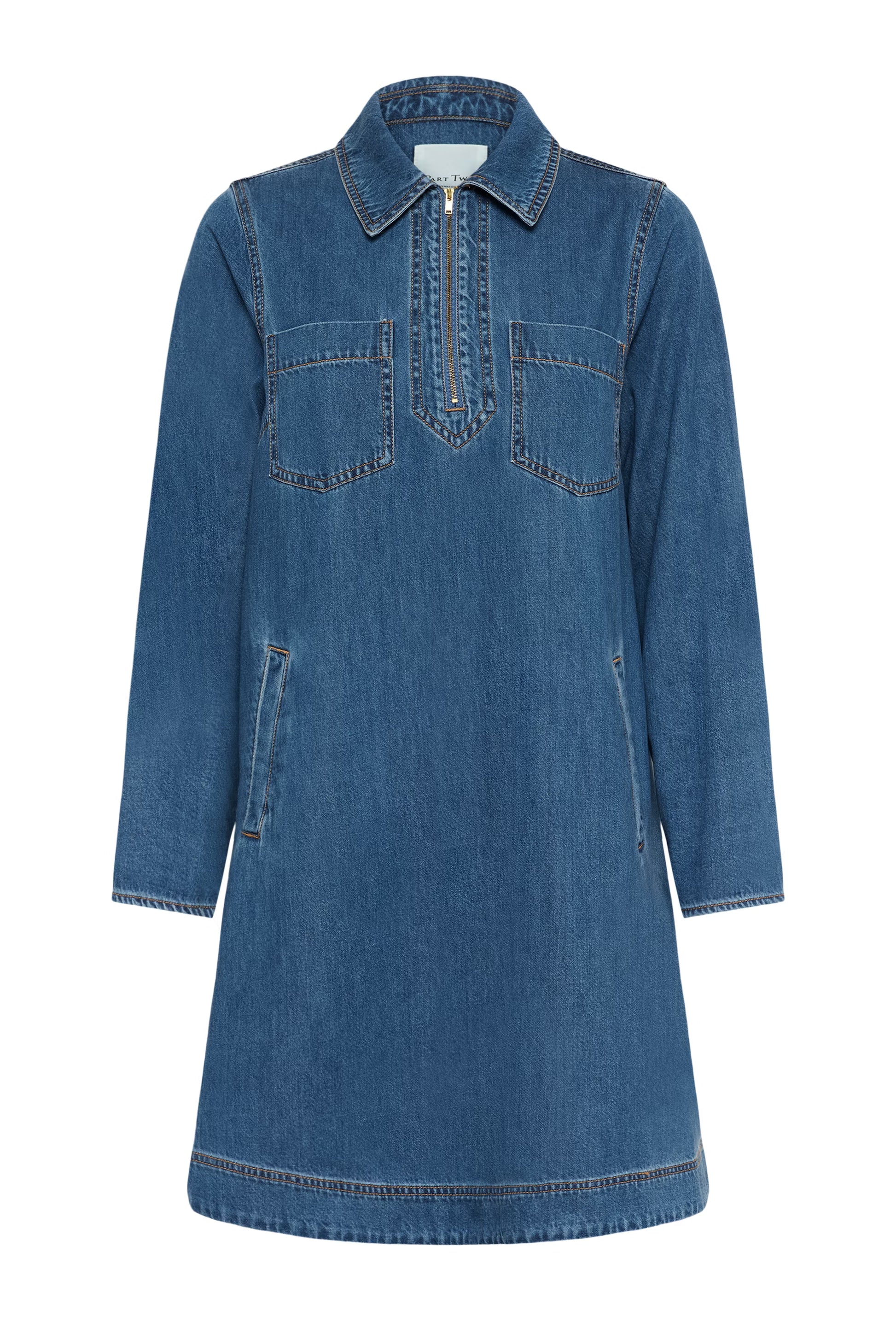 The model is 174 cm tall and is wearing a size 36. This denim dress is cut from a soft cotton blend and has a relaxed fit with long sleeves and practical side pockets. The classic shirt collar and decorative stitching add a timeless look. Wear it with boots or sneakers depending on the season and occasion.