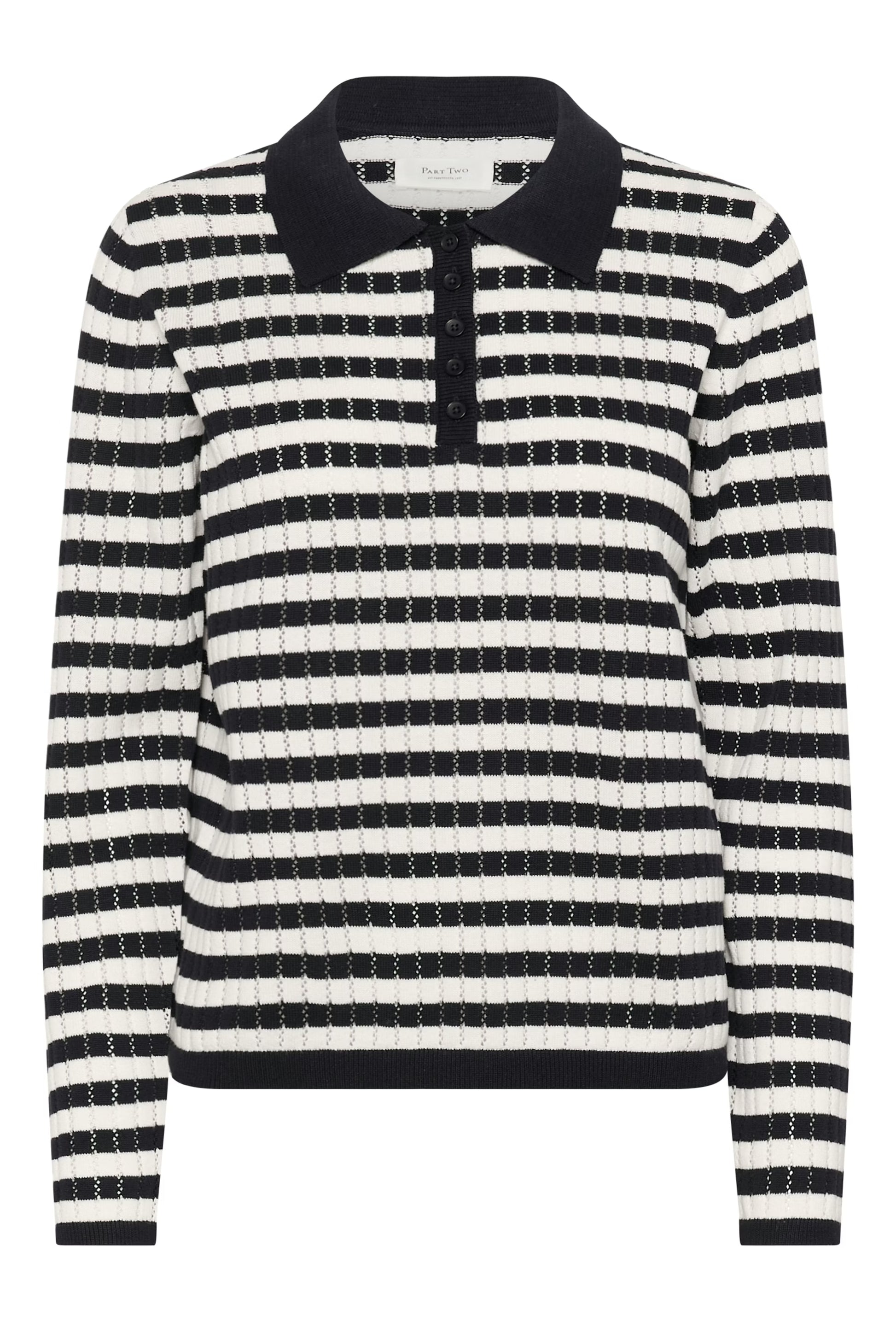 The model is 174 cm tall and is wearing a size M. This striped knit sweater in navy and white is made in a light, breathable quality with fine hole patterns. It has a collar and button closure at the front, which gives a classic and timeless look. Style it with chinos or jeans for a relaxed, maritime look.